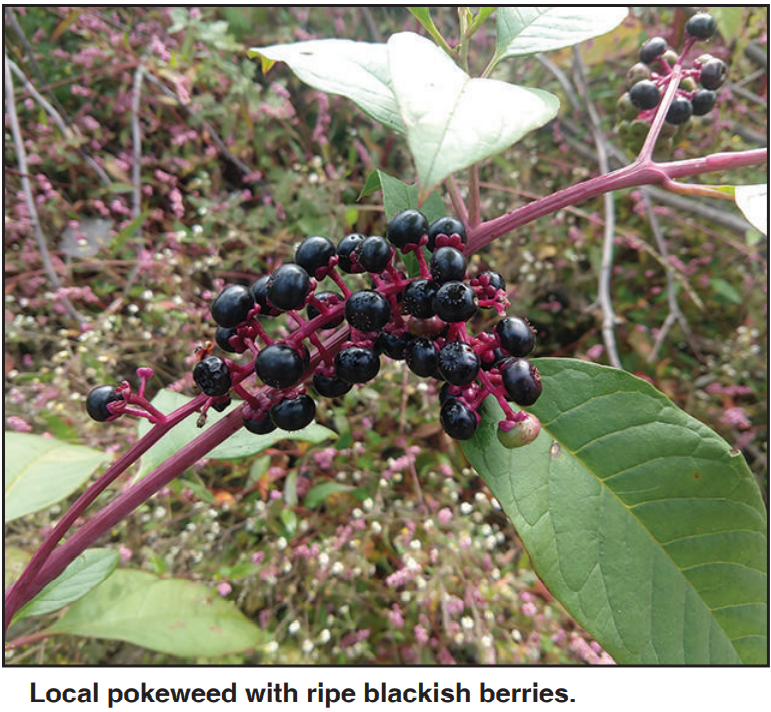 Pokeweed is native to our part of the world. Some say its name – poke – is a version of the Algonquin word “pocan” or “puccoon” meaning a plant that contains dye. Deep purple is the color of the poke berry when ripe. On its long berry cluster, fruit can be at every stage of ripening – from pale green to reddish green to blackish purple.