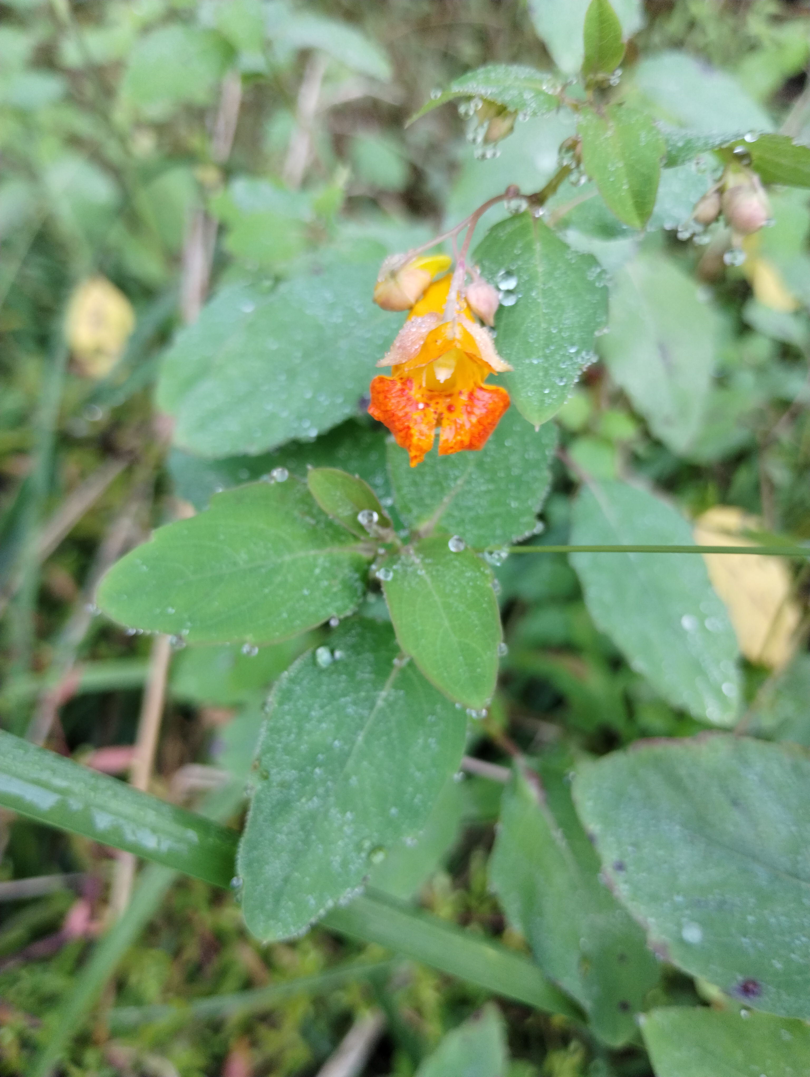 Orange jewelweed — a small orange orchid-like bloom on tall, leafy plants that are hardy enough to grow in both wet and dry locations. It’s known to herbalists as an effective remedy for poison ivy rashes.