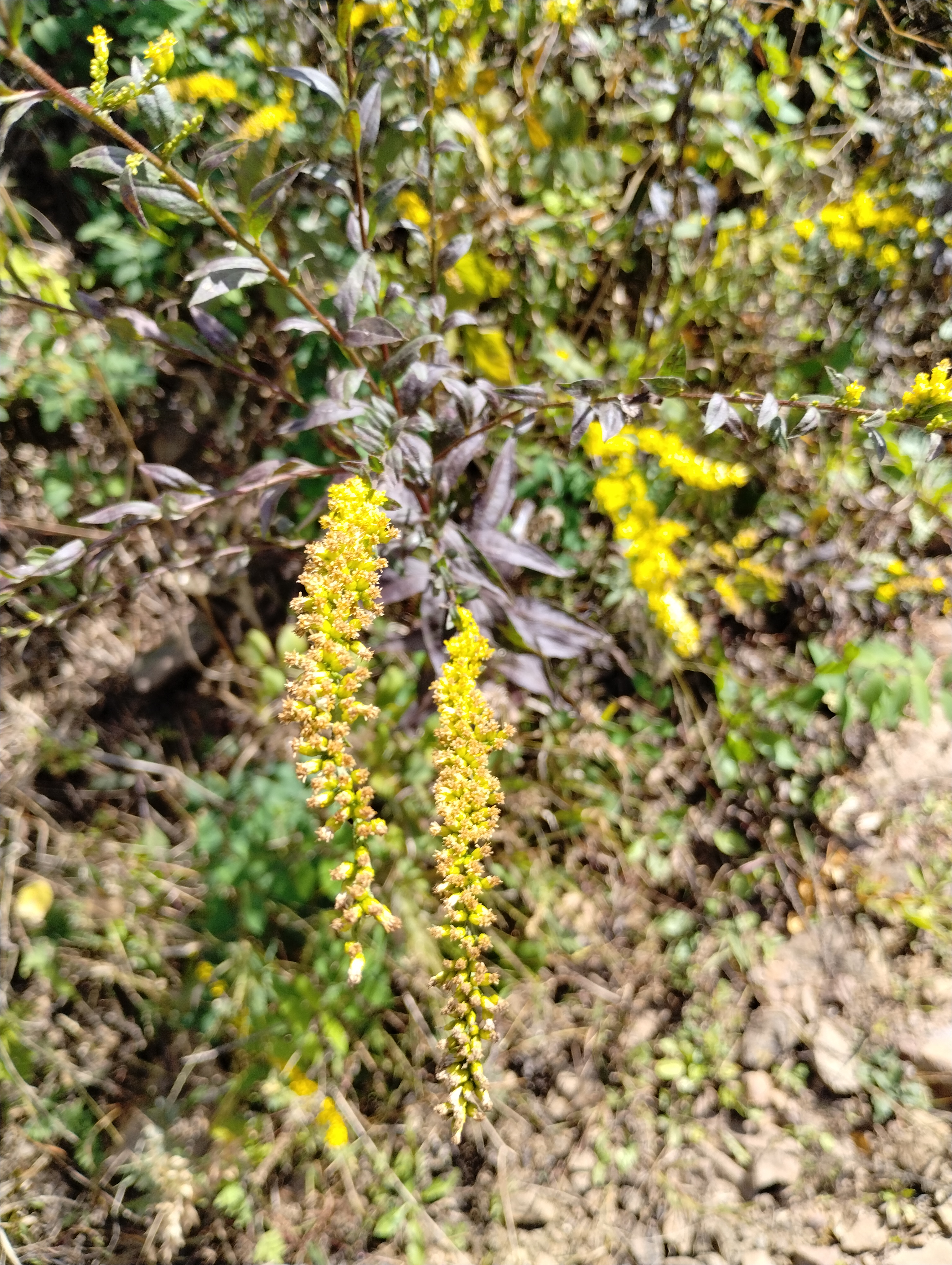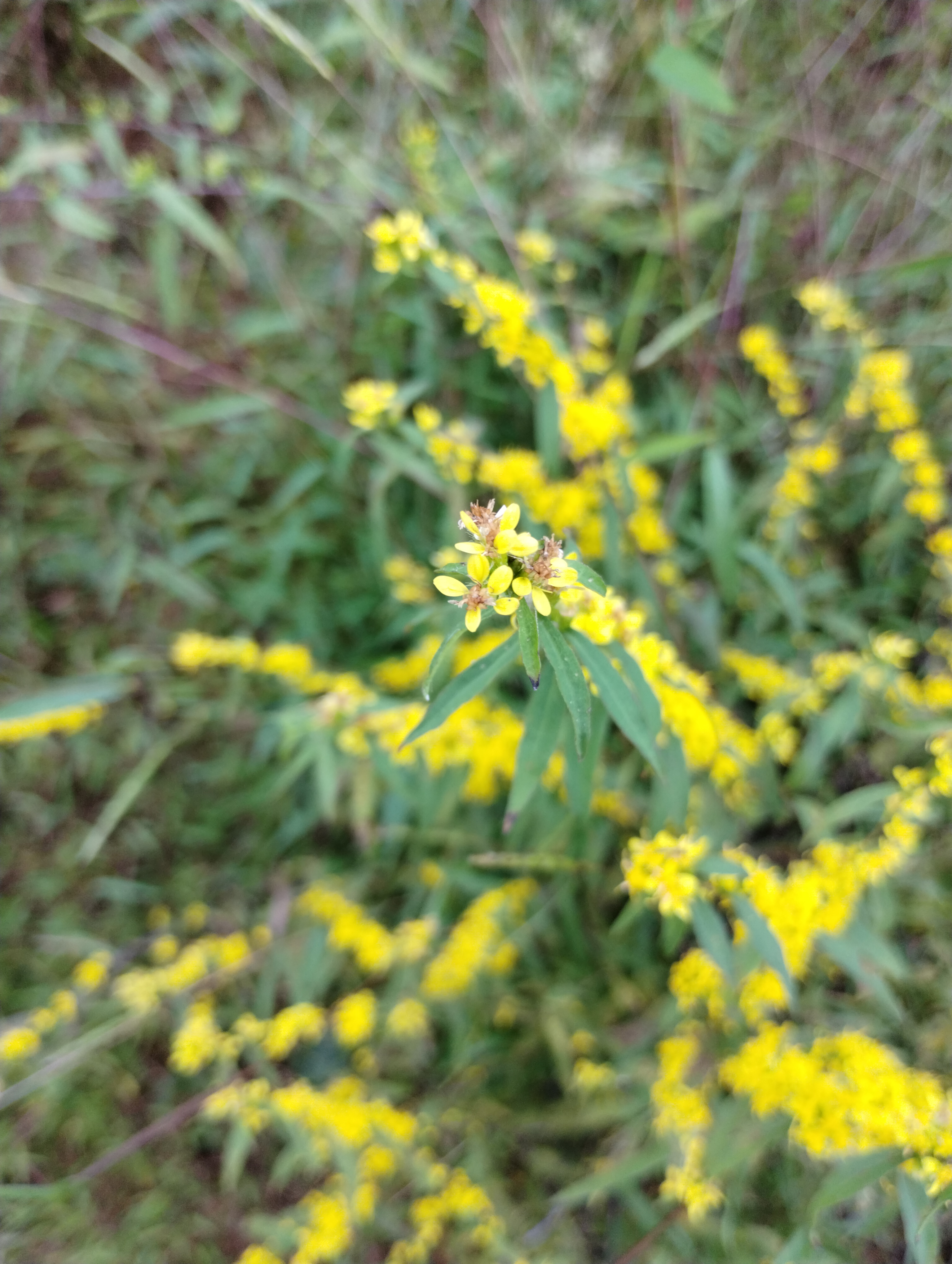 ALL THE GOLDENROD! On a four-mile hike today, I spied four separate varieties of goldenrod…who knew there were so many? Growing within a mile of each other were Candian goldenrod, Bluestem goldenrod, Grass leaved goldenrod and Wrinkleleaf goldenrod. Each display the usual golden flower, but in different arrangements on the stem, and clustered in unique ways. All were growing along a rocky dirt road in a public wildlife area that had been timbered three or four years ago.